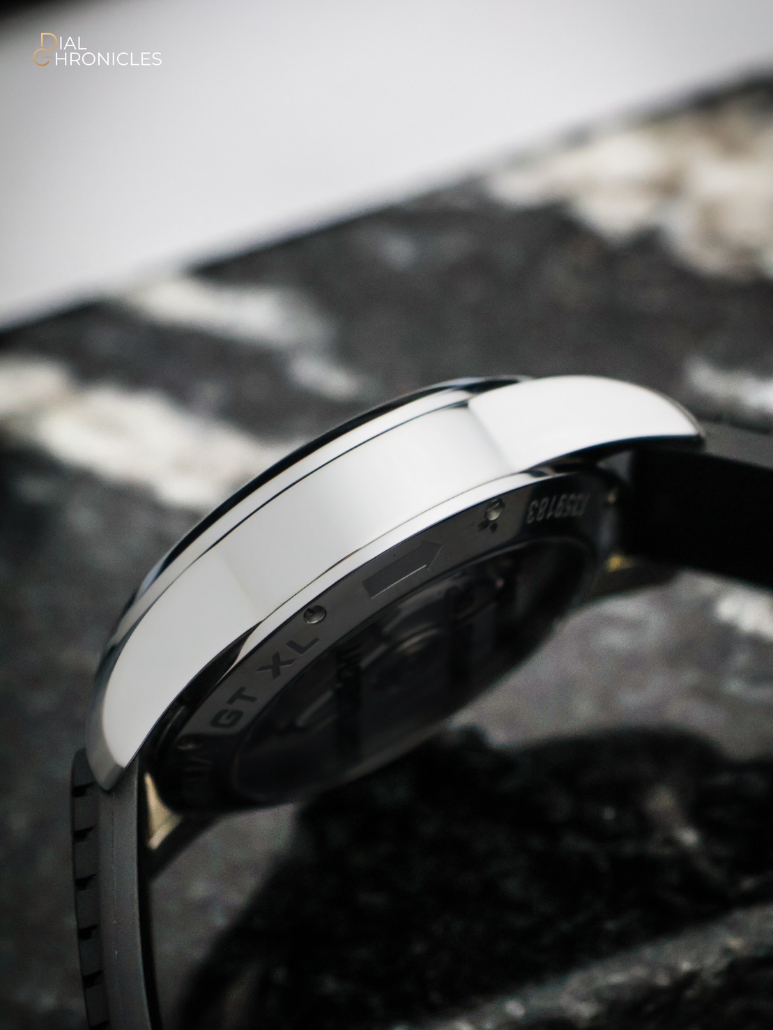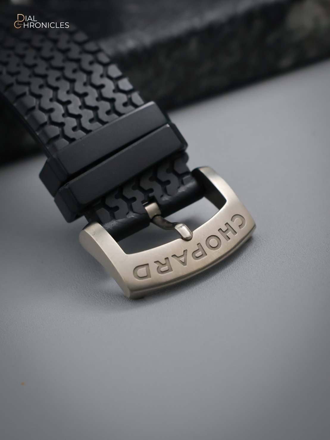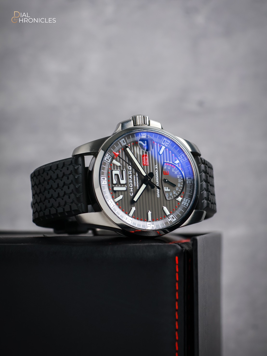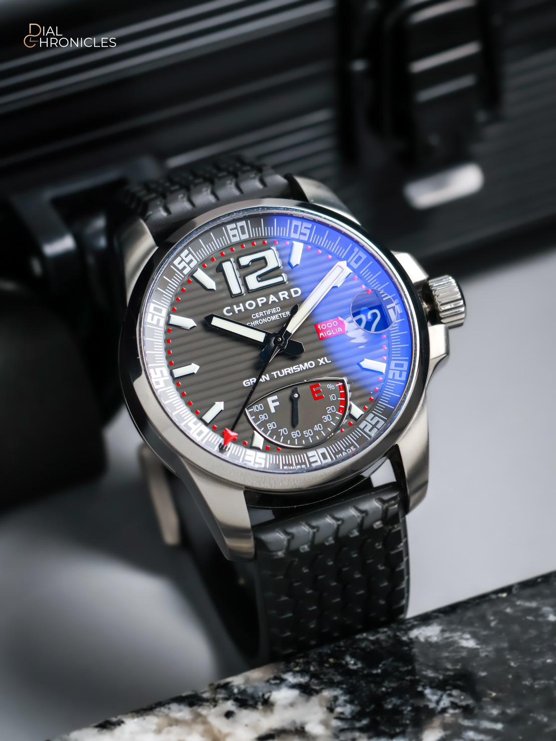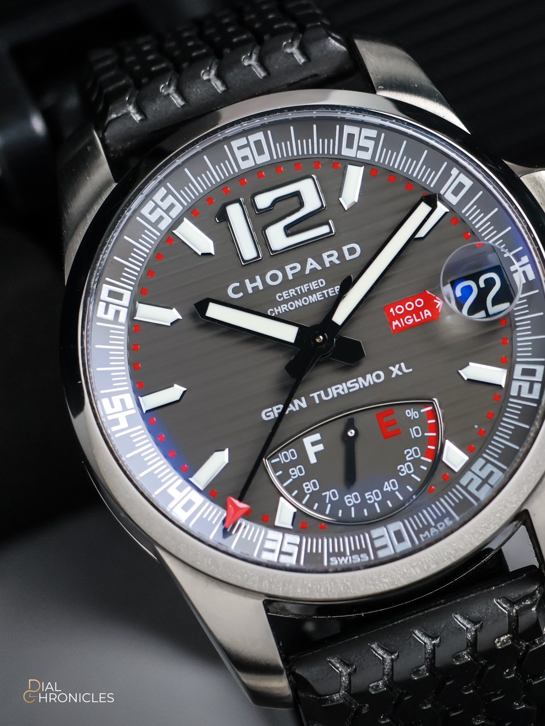 นาฬิกาสปอร์ตจากคอลเลคชัน Mille Miglia ได้แรงบันดาลใจจากการแข่งรถ ตัวเรือน Titanium ขนาด 44 mm. หน้าปัดสีเทาแกะลาย ช่องวันที่พร้อมเลนส์ขยายที่ตำแหน่ง 3 นาฬิกา และ Power Reserve ที่ตำแหน่ง 6 นาฬิกา ที่ออกแบบเป็นเกจ์วัดน้ำมัน เครื่อง Automatic สายยางลายล้อรถ บัคเคิ้ล Titanium